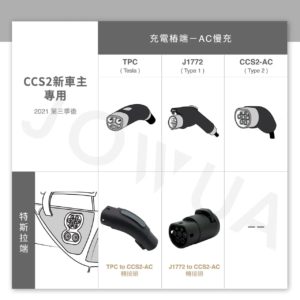 相容所有公有停車場 Type 1 (J1772) 充電器、保時捷、Noodoe 及Tesla J1772充電樁,CCS2 車主接上此轉接頭才能充電。