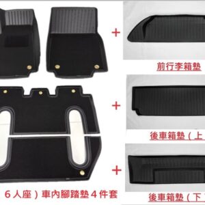 包裝內容:車內腳踏墊四件組 + 前行李箱墊+ 後車箱墊(上)+ 後車箱墊(下)